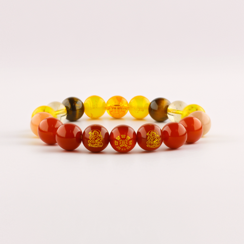 Its stones weave earth’s patience with fire’s momentum. The earth essence (Balance Earth, Yellow Wealth God) anchors the wearer in practical abundance, shielding against impulsivity while fostering long-term wealth. The forge’s fire (Red Agate, Sunstone) fuels decisive action, dissolving fear and revitalizing ambition. Together, they temper extremes: earth prevents reckless risks, fire sparks progress without burnout.