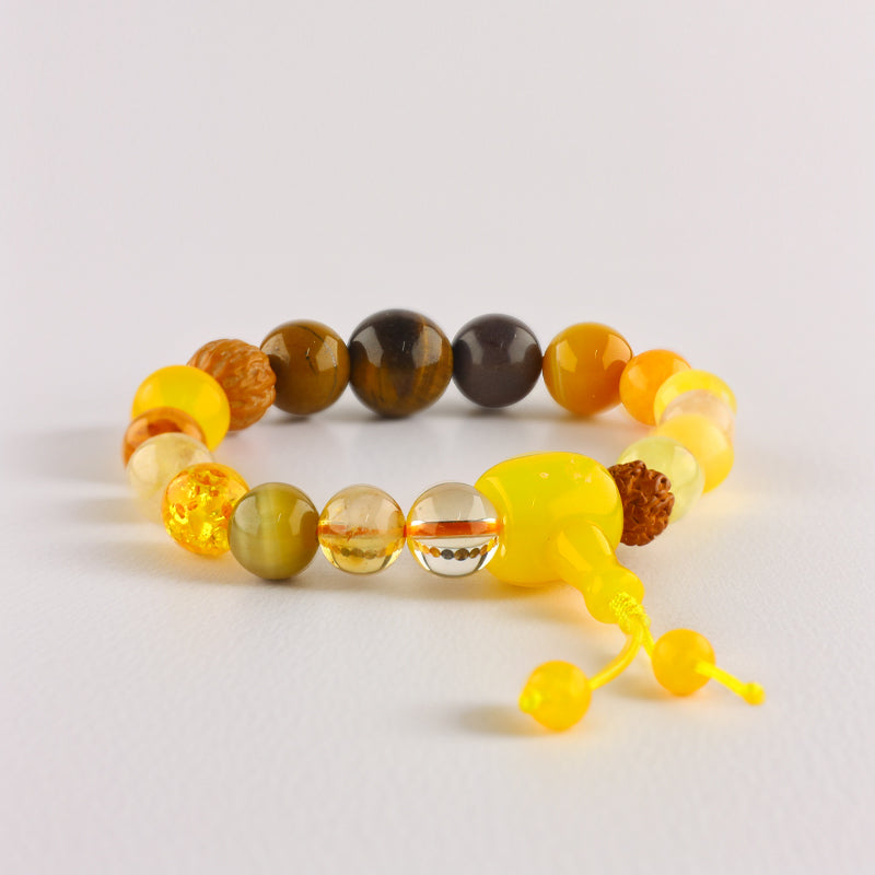 Dawn finds Yellow Chalcedony smoothing thoughts like river stones. At crossroads,Golden Eye Stone sharpens vision. Dusk brings Myanmar Yellow Jade and Beeswax spinning stillness into twilight. The bracelet learns your pulse—recording triumphs, absorbing storms, humming resilience when night falls.